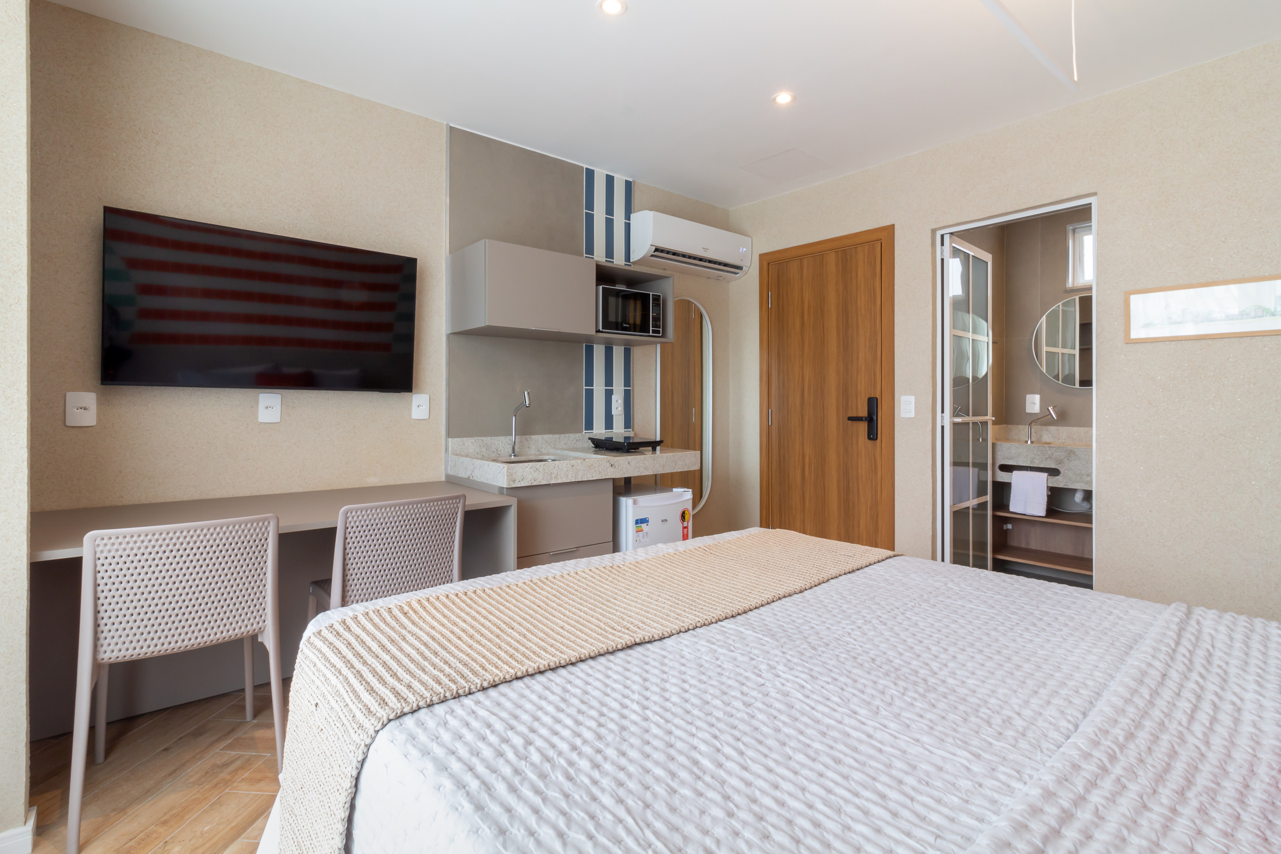 El espacio aún ofrece comodidades que van más allá de lo esperado, incluyendo un área de coworking, ideal para quienes necesitan conciliar ocio y trabajo, y un práctico mercadito inteligente, garantizando un acceso rápido a artículos esenciales sin salir del condominio. Para su conveniencia, hay también un guardarropa de 1 volumen y un vestuario, con ducha y sanitario, ambos disponibles gratuitamente para los huéspedes, además de recepción 24 horas. Todo fue pensado para proporcionarle una estancia con el máximo de comodidad, practicidad y conveniencia.